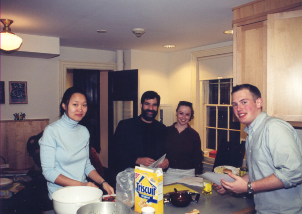 Joon Kang, Al Filreis, Jill Ivey, and Josh Kruger in the kitchen practicing their parts in a community celebration of Kerry Sherin Wright