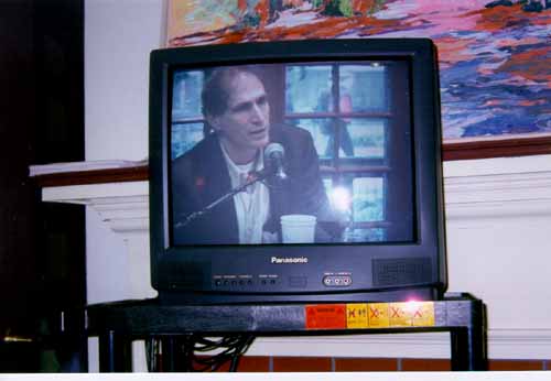 | Rich Bloom, I.T. support specialist, monitors the live Webcast poetry discussion at Writers House on July 8, 1999. Viewers on the Internet e-mailed their questions to a panel of Penn faculty and staff, including, in blue shirt, Al Filreis; to Al's right, Shawn Walker; to Al's far left (in white t-shirt) Bob Perelman, and to Bob's right, Kristen Gallagher. The event was reported by the Summer Pennsylvanian. |