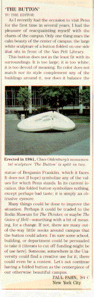 Many things could be done to improve the situation. Perhaps it could be traded to the Rodin Museum for The Thinker; or maybe The Gates of Hell -- something with a bit of meaning, for a change. If not, there are many out of-the-way little nooks around campus that the button could adorn. I'm sure some school, building, or department could be persuaded to take it (threats to cut off funding might be of use here). Someone, somewhere in the University could find a creative use for it; there could even be a contest. Let's not continue having a folded button as the centerpiece of our otherwise beautiful campus.