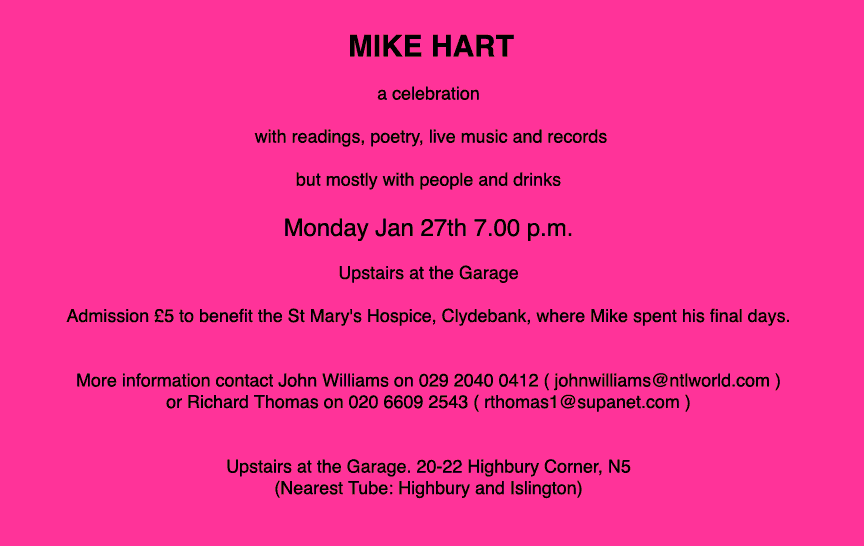 For details of a celebration of Mike Hart, in London, on January 27th. click HERE.