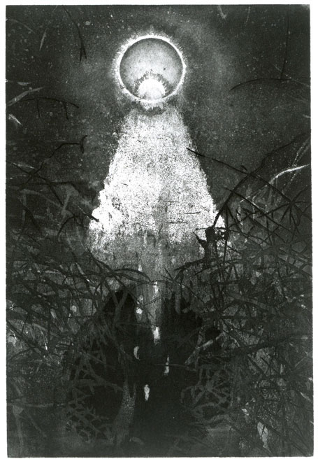 This first part of the story finishes in 1993. As much as I appreciated the wide audience the book gave to the reproductions—it has gone to at least seven editions—what is printed in the FSG edition is a mediocre presentation of the original work done for it. One final set of monotypes remains and is rarely seen. This began to bother me as I felt the real work was misrepresented. I began toying with the idea of an etched version where the original could be seen with an extended amount of text instead of a caption. I made about eleven plates between 1994 and 1999 when I decided to complete the project as an artist's book and publish it myself. An invitation to exhibit it at Castelvecchio in Verona—the castle of Dante's patron Can Grande della Scalla—was the catalyst for this decision.