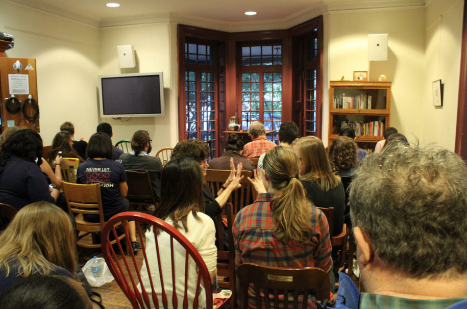 On Tuesday October 6th, the Kelly Writers House hosted “No Line Breaks,” a program that allowed KWH-affiliated students a chance to read their prose in front of an audience. KWH director Jessica Lowenthal introduced each of the five students: Ayont Young (N’18), Meg Pendoley (C’16), Kaitlin Moore (C’18), David Marchino (C’16), and Alina Grabowski (C’16). Ayont, a sophomore who balances writing and her intense nursing schedule, read a poetic piece of personal fiction about family and religion called “Doublemint Gum.” Meg, an award-winning triple threat (she writes poetry, fiction and translations), read two fiction pieces - “Countersing” and “Stuck.” Kaitlin, a former Astrophysics major and author of two novels who includes her love of science in her writing, read two of her own pieces - a personal essay “Relativity” and a short story “A Million Broken Things.” David, a Philly native and “generous exhibitionist,” read two pieces on influential women in his life - one on Bubbles, an exotic dancer, and the other about his mother. Alina, an award-winning senior who “has a habit of being silent all class then being suddenly brilliant when she speaks up,” read an excerpt from her short story collection about set in Massachusetts and centered around a drowning. After the reading the students and their admirers ate a tasty reception that includes many trays of mac n cheese and bread pudding.